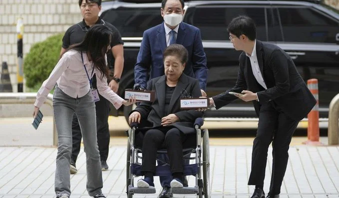 Dr. Hak Ja Han being questioned by reporters on her way to court to attend a hearing to review her arrest warrant requested by special prosecutors in Seoul, South Korea, September 22, 2025 [Lee Jin-man/AP]